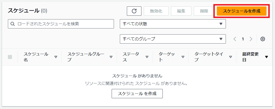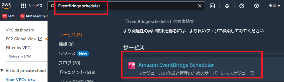 「EventBridge scheduler」を検索し、サービス画面を起動します。