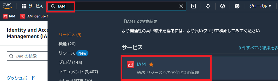 「IAM」で検索し、「IAM」サービスコンソールに接続します。