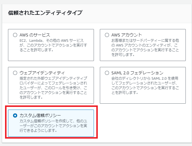 信頼されたエンティティタイプは「カスタム信頼ポリシー」を選択します。