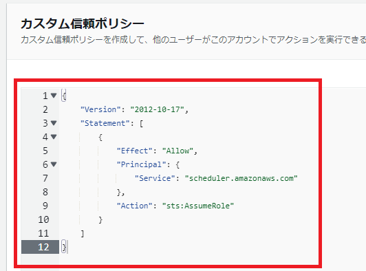 カスタム信頼ポリシーに下記の内容を貼り付けます。これにより、「誰が」「どのAWSサービスの」「どのリソースに対して」「どんな操作を」「許可する(許可しない)」、といったことを定義することができます。