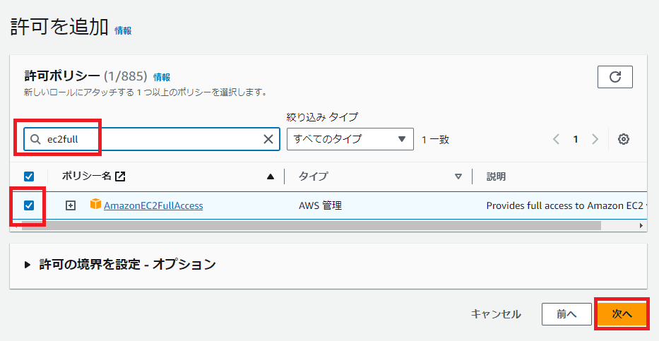 許可ポリシーで「ec2full」を検索し、「AmazonEc2FullAccess」を選択した状態で「次へ」