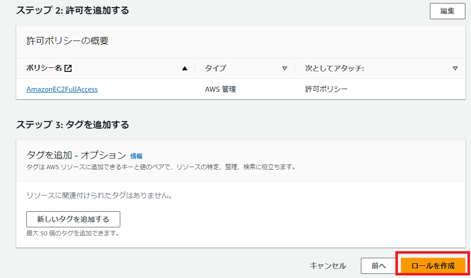 許可ポリシーに「AmazonEc2FullAccess」があることを確認し「ロールを作成」