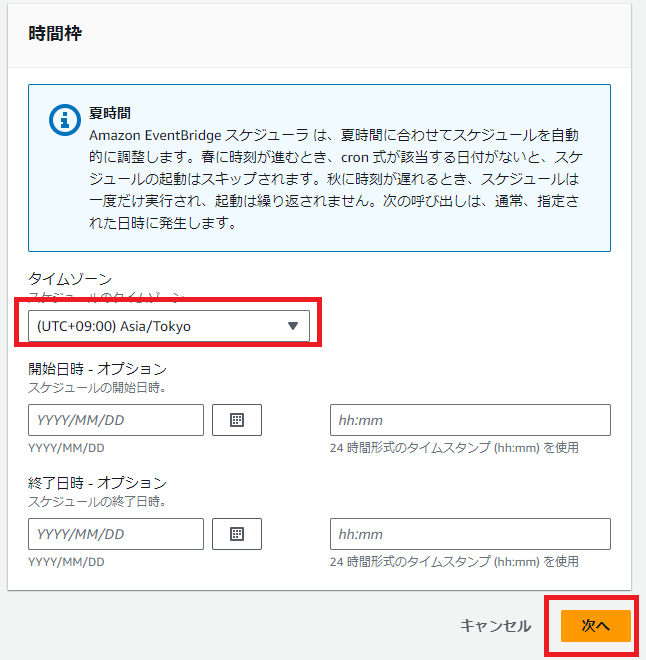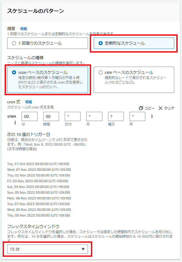 フレックスタイムウィンドウはOFFでも良いのですが、ここでは15分を指定しています。これにより、00:00-00:15のどこかで実行されることになります。