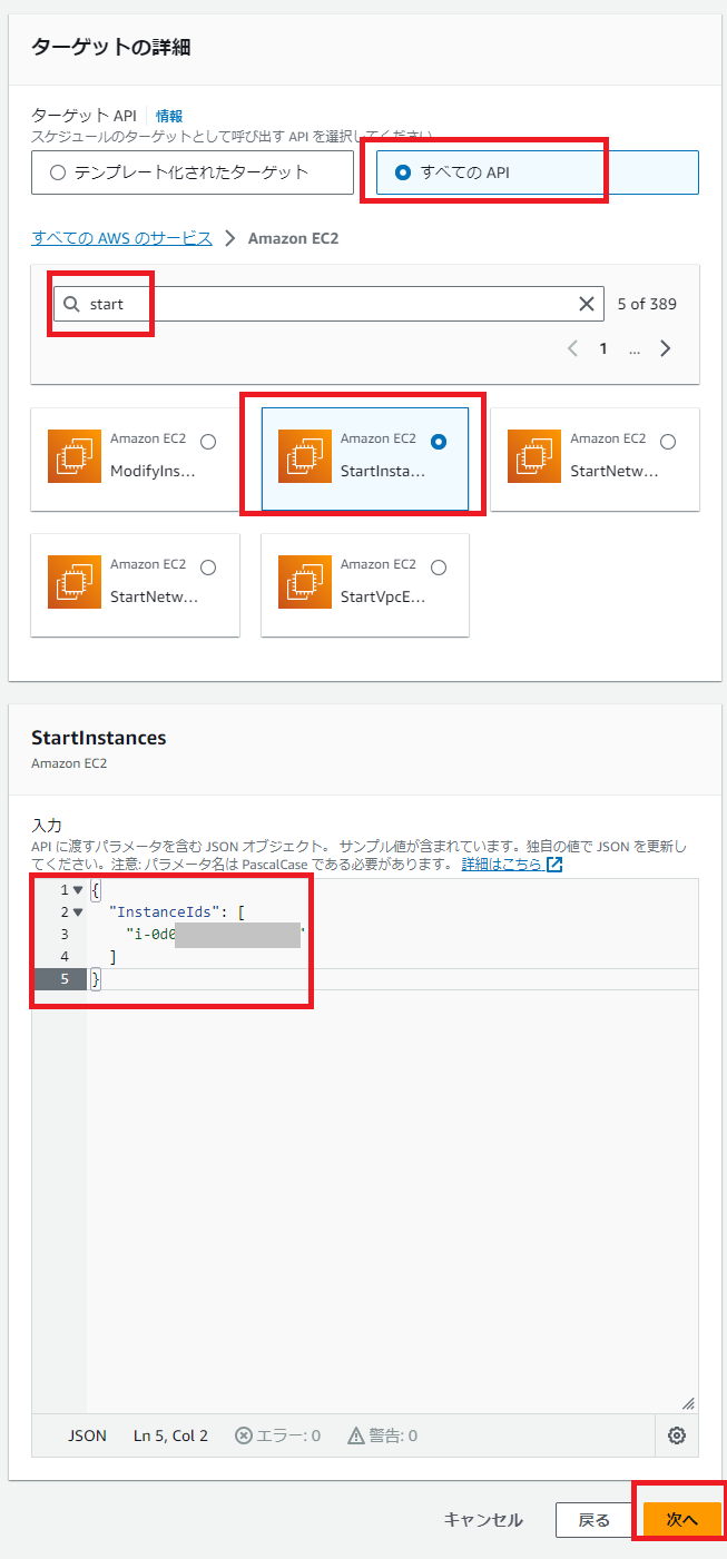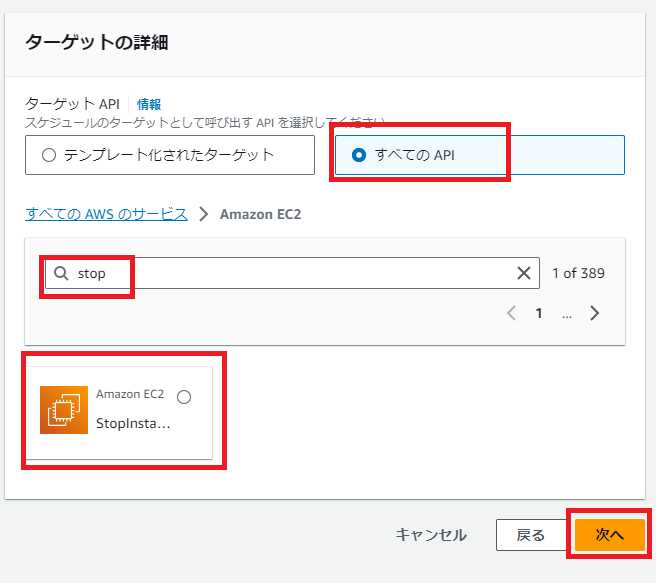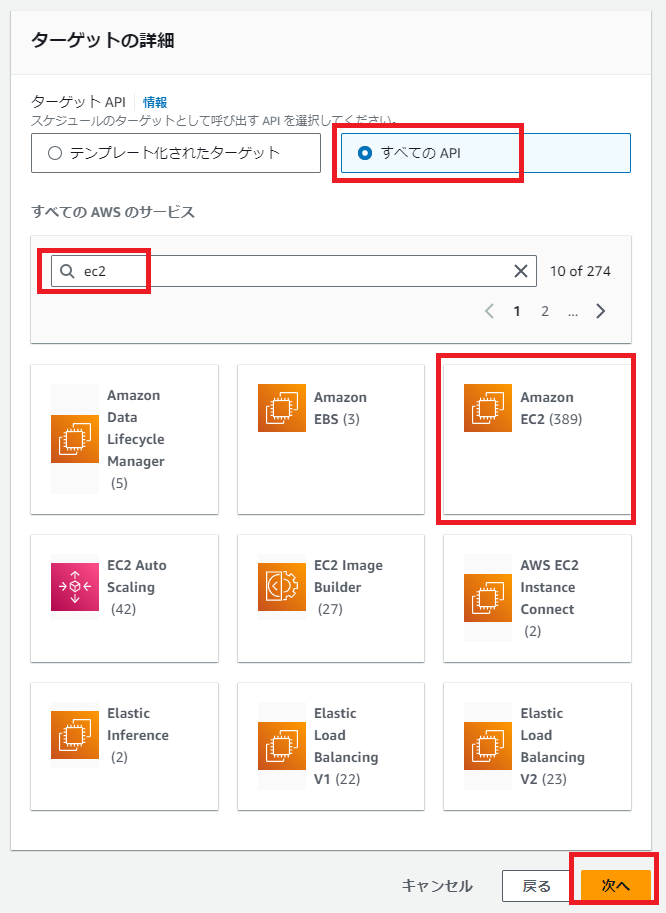 ターゲットの詳細では、「すべてのAPI」から「Amazon EC2」を指定します。