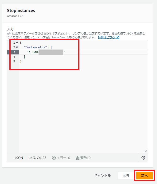 APIには対象のEC2がどれか?を指示する必要があるので、対象EC2のインスタンスIDを入力します。