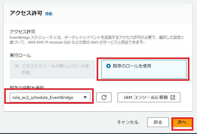 アクセス許可の画面では、先ほど作成したIAMロールを指定します。
